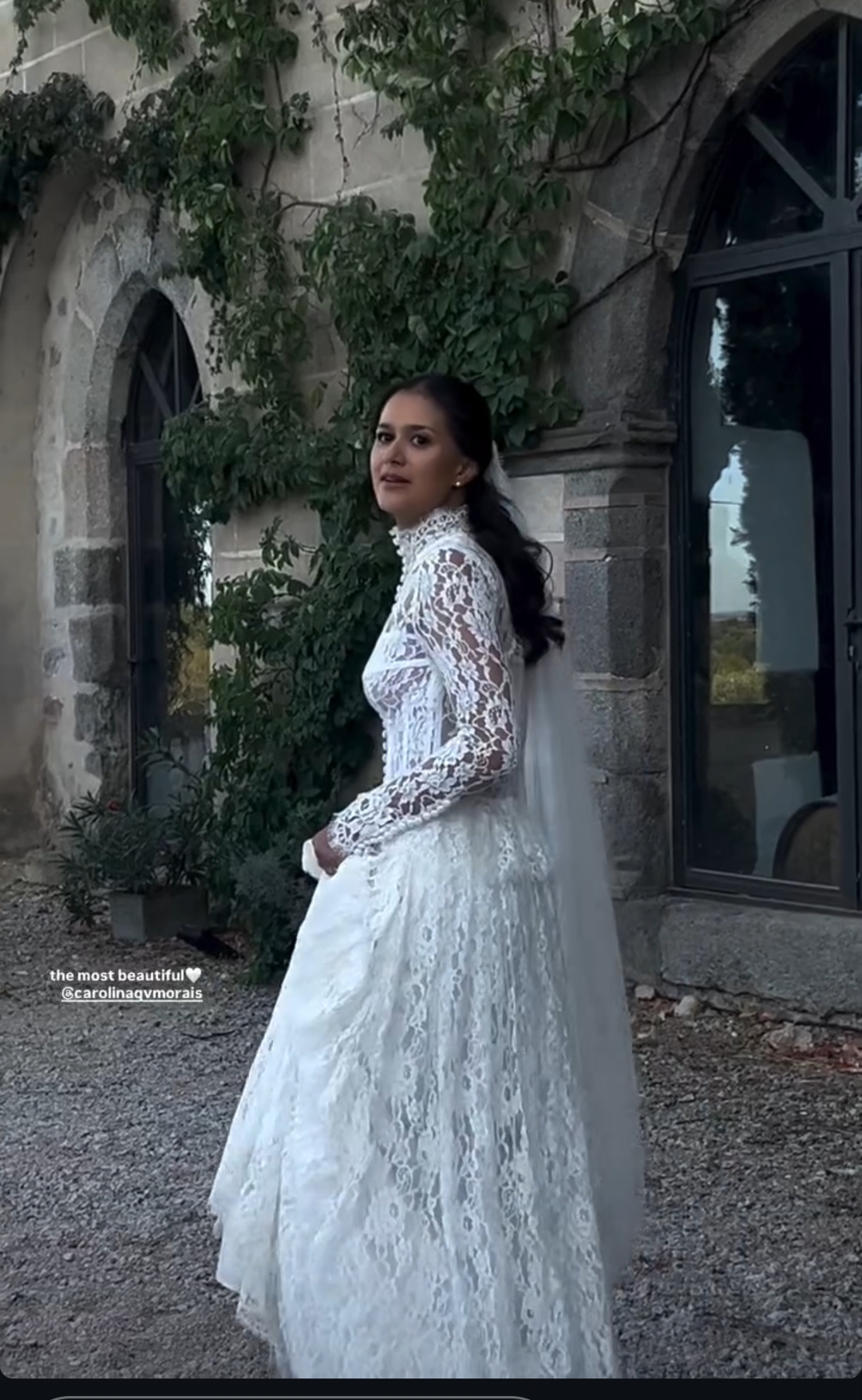 Modelo Cristina Caeiro, com elegante vestido de renda e de uma saia princesa com 24 metros de tule e uma tiara @anaesteves_acessorios, reproduzindo um vestido de um conto de fadas.